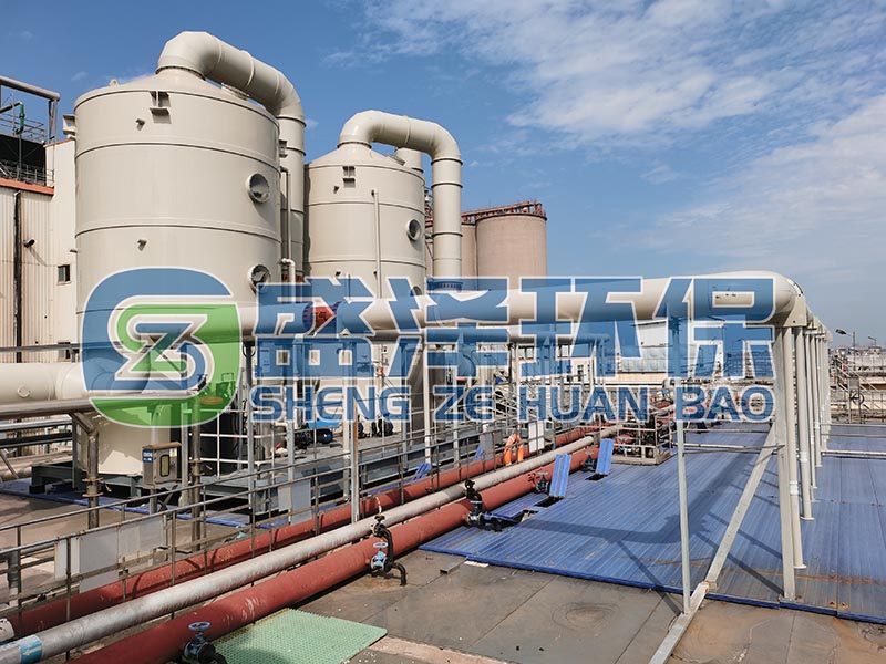 噴淋塔主體材質(zhì)為PP,堿洗塔內(nèi)置有填料(PP),氣液接觸比表面積大。循環(huán)液通過(guò)噴淋,均勻分布至填料層,充分和廢氣接觸,優(yōu)化氣液比。洗噴淋最上端噴淋組件的上部設(shè)有除霧器,廢氣穿過(guò)循環(huán)液噴淋層后,再連續(xù)流經(jīng)除霧器(PP絲網(wǎng))時(shí),除去廢氣中所含液滴。堿噴淋塔設(shè)有二級(jí)噴淋,增加處理效果。