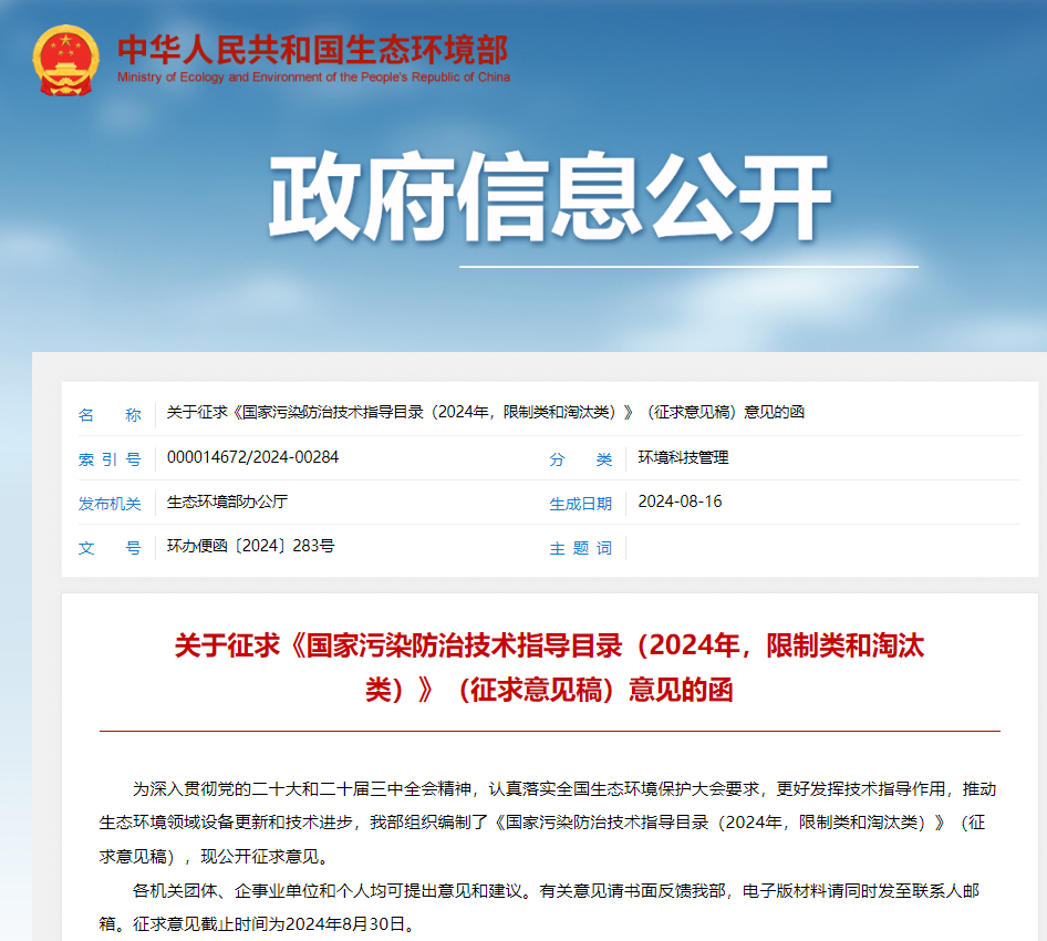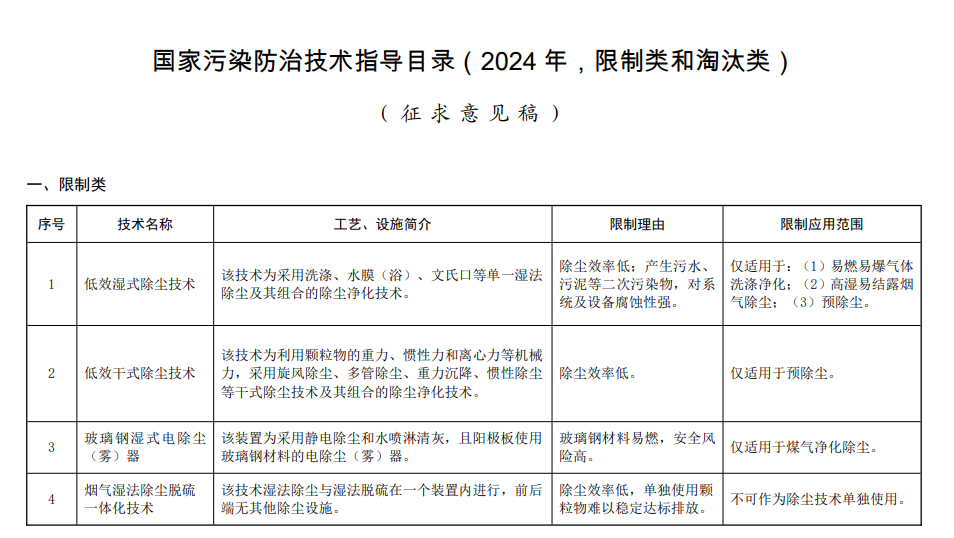《國家污染防治技術(shù)指導(dǎo)目錄(2024 年,限制類和淘汰類)》(征求意見稿)共有 20 項技術(shù),