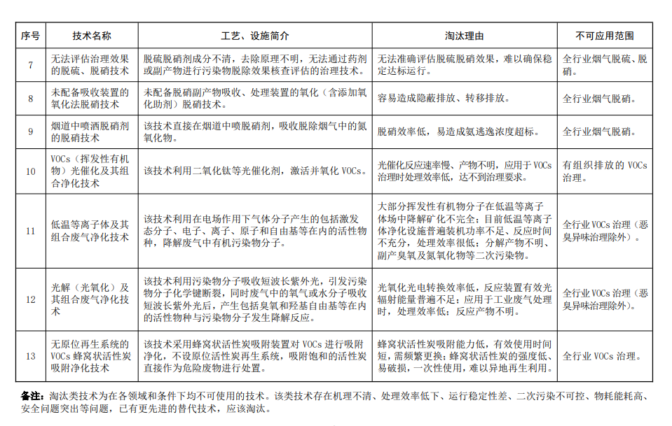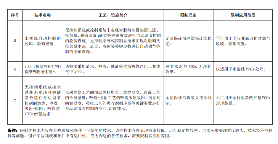 其中限制類7 項,淘汰類13項,涉及除塵、脫硫脫硝、VOCs治理等大氣污染防治細(xì)分領(lǐng)域。